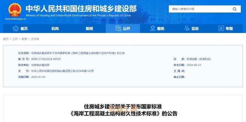 2024年9月23日,住房和城鄉建設部官方網站發布關于國家標準《混凝土長期性能和耐久性能試驗方法標準》的通告,現批準《混凝土長期性能和耐久性能試驗方法標準》為國家標準,編號為GB T 50082—2024,自2025年1月1日起實施。